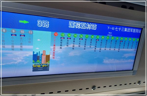 廈門的公車的車廂內,有似捷運顯示下一站的跑馬燈